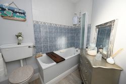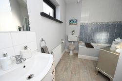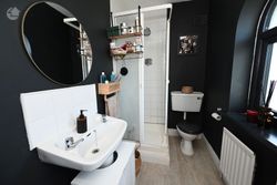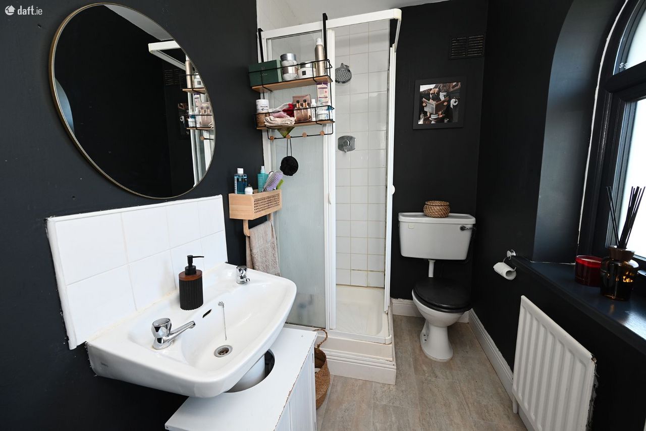 Tile effect floor, W.H.B., W.C., shower unit, radiator.